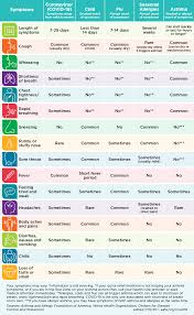 Allergies vs covid 19 chart. Covid 19 progresses over a few days with increasing severity of signs and symptoms in people who have symptoms while people with allergies usually have signs and symptoms in minutes to hours after exposure to a trigger substance. Covid 19 is a contagious respiratory illness caused by infection with a new coronavirus called sars cov 2 the virus that causes covid 19. What does being sick with covid 19 look like compared with a cold or the flu. Allergies typically cause nasal symptoms such as a runny nose and sinus congestion but do not usually result in a fever as is found with.